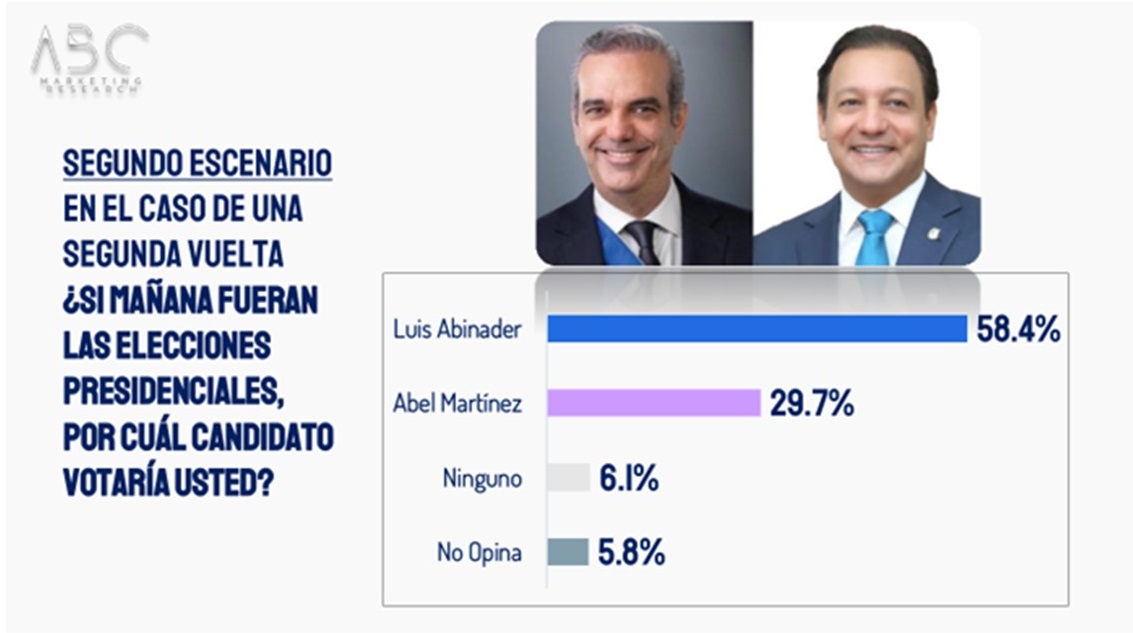En el escenario de que los candidatos fueran Luis Abinader (PRM) y Abel Martínez (PLD), el 58.4% votaría por Abinader, mientras el 29.7% lo haría por Martínez, un 6.1% por ninguno y el 5.8% no opinó.