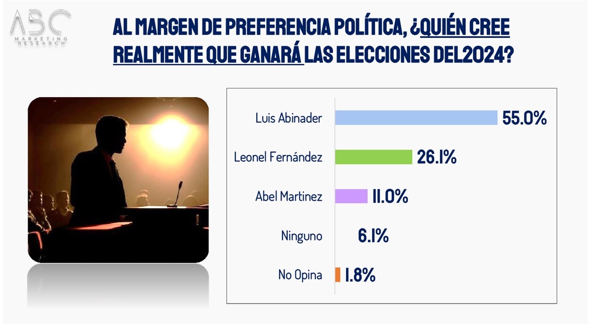 Se preguntó a los consultados que, al margen de preferencia política, ¿quién cree realmente ganará las elecciones presidenciales del 2024? El 55.0% dijo que Luis Abinader, un 26.1% Leonel Fernández, el 11.0% Abel Martínez, un 6.1% ninguno y el 1.8% no opinó.