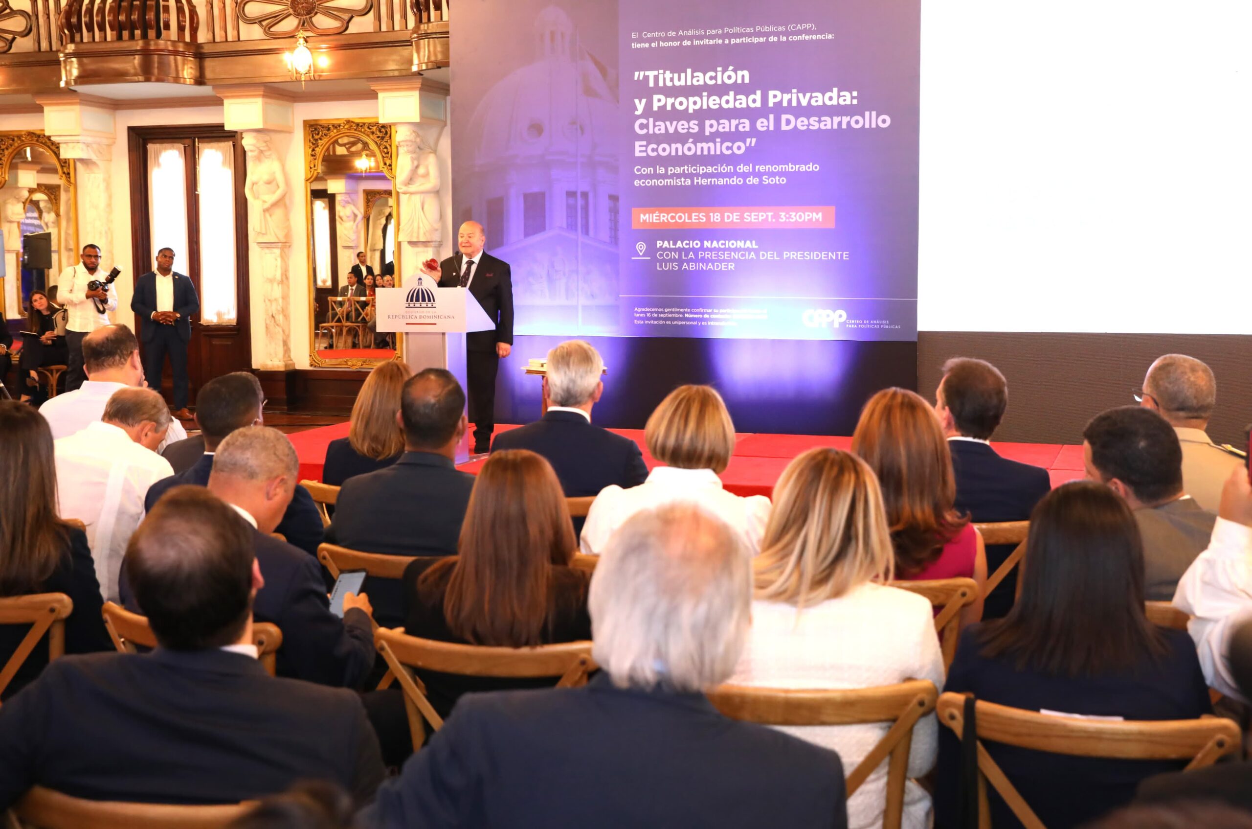 Esas palabras fueron expresadas por el mandatario junto a la vicepresidenta Raquel Peña, quienes encabezaron este miércoles la conferencia «Titulación y Propiedad Privada: Claves para el Desarrollo Económico», la cual fue dictada por el economista peruano Hernando de Soto en el salón Las Cariátides.