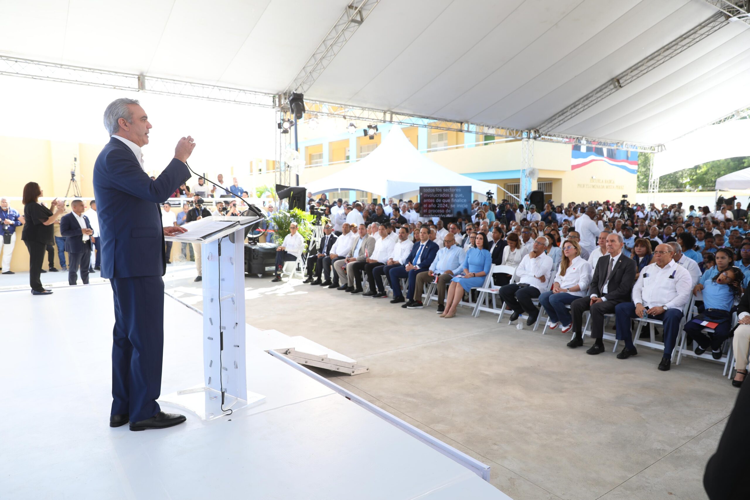 En el acto de inicio del año escolar 2024-2025 en el que más de dos millones de estudiantes de los diferentes niveles y modalidades del sector público retornarán a las aulas para continuar recibiendo una educación inclusiva y de calidad, el gobernante dejó inaugurada la escuela básica profesora Yluminada Mejía Pérez de Arroyo Hondo.