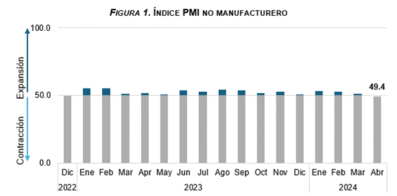 Por un lado, el desempleo general del país norteamericano se ubicó en 3.9 % en abril, un ligero incremento respecto al nivel de 3.8 % del pasado mes de marzo de 2024, con la creación de 175,000 nuevos empleos. Adicionalmente, el índice de gestores de compras (PMI por sus siglas en inglés) no manufacturero del Instituto de Gerencia y Abastecimiento (ISM por sus siglas en inglés) registró un valor de 49.4 en el mes de abril, levemente por debajo del 51.4 de febrero de 2024.