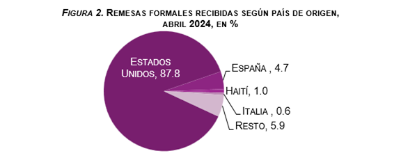 El BCRD explica que el desempeño económico de los Estados Unidos fue uno de los principales factores que incidió sobre el comportamiento de las remesas, ya que desde ese país se originó el 87.8 % de los flujos formales del mes de abril, unos US$688.7 millones.