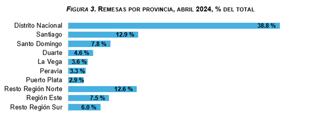 Respecto a la distribución de las remesas recibidas por provincias, el BCRD señala que el Distrito Nacional recibió una proporción del 38.8 % durante abril, seguido por las provincias de Santiago y Santo Domingo, con un 12.9 % y 7.8 %, respectivamente. Esto indica que más de la mitad (59.5 %) de las remesas se recibe en las zonas metropolitanas del país.