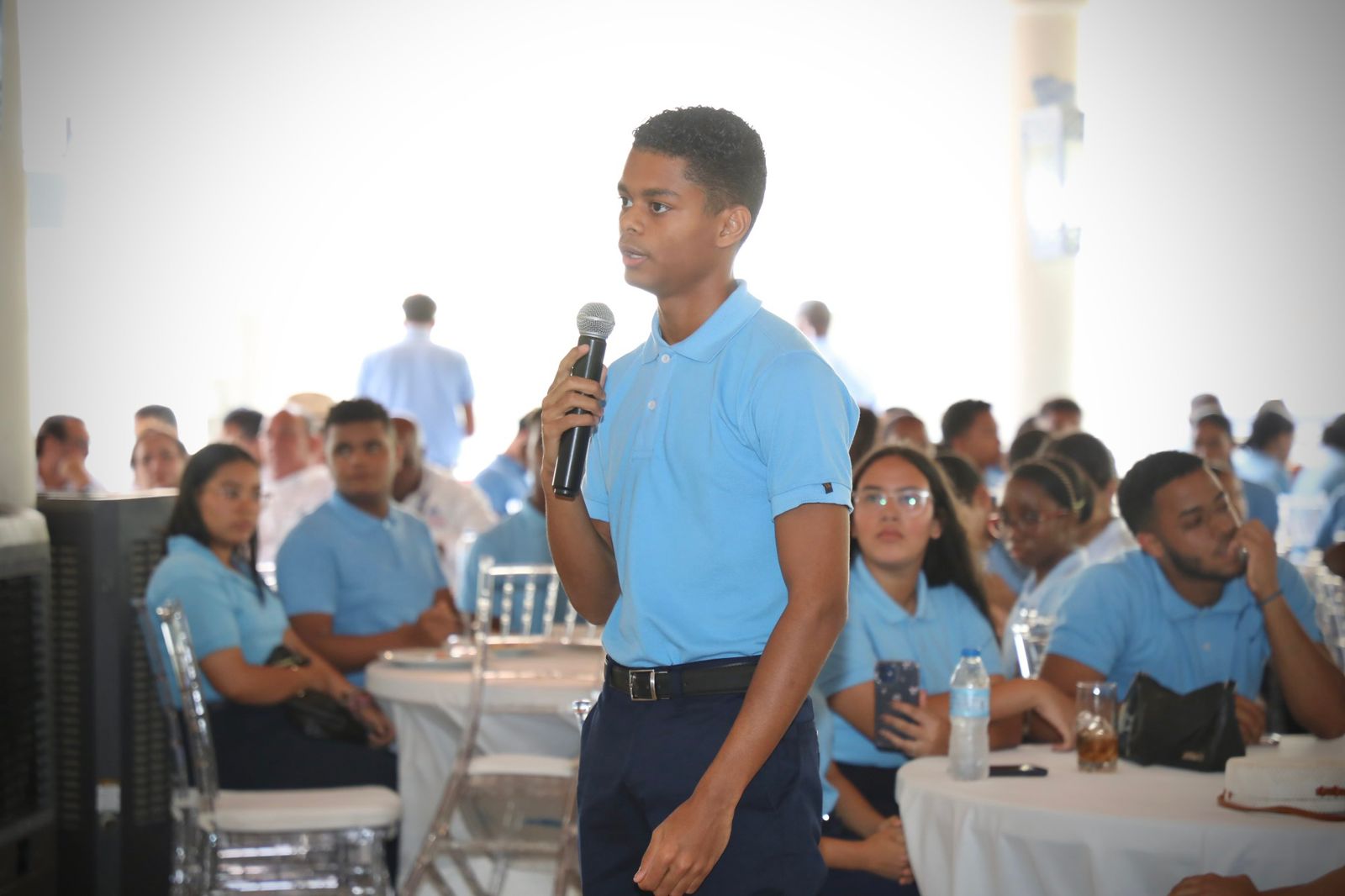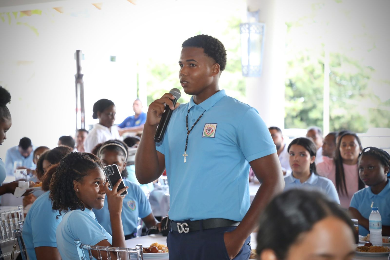 La estudiante Liz Yomairi Mercedes Abreu, en representación del Politécnico Santa Mariana Olea, agradeció la cercanía del presidente Abinader con la comunidad educativa y destacó que este encuentro demuestra que la voz estudiantil es escuchada desde los más altos niveles. Reconoció el compromiso del Gobierno con una educación más equitativa, de calidad e innovadora.