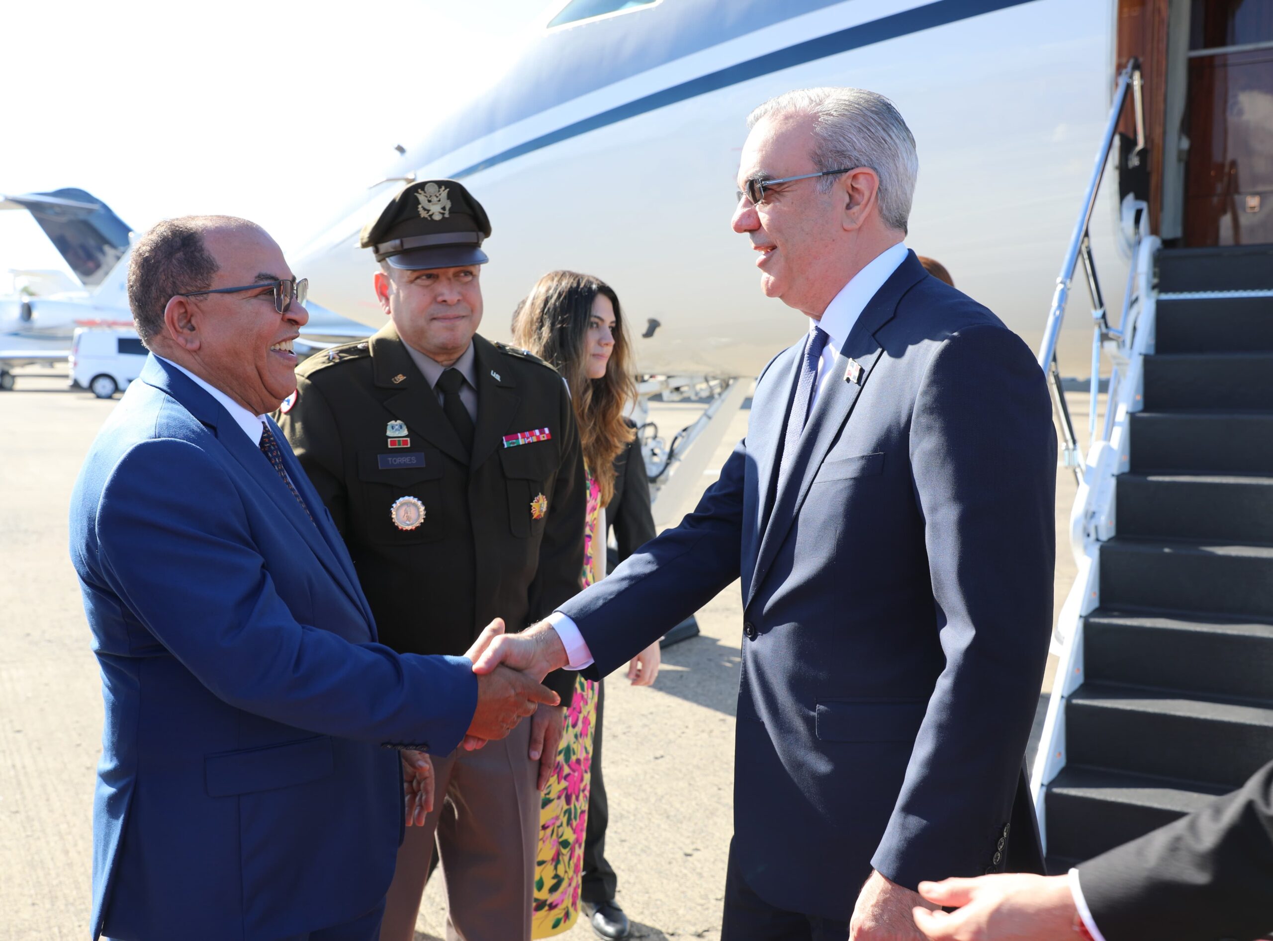 El mandatario dominicano llegó a la nación puertorriqueña a las 9:40 de la mañana de este jueves por la ciudad de San Juan, para asistir a la toma de posesión de la nueva gobernadora, González Colón. donde fue recibido por la secretaria de Estado de Puerto Rico, Verónica Ferraioli