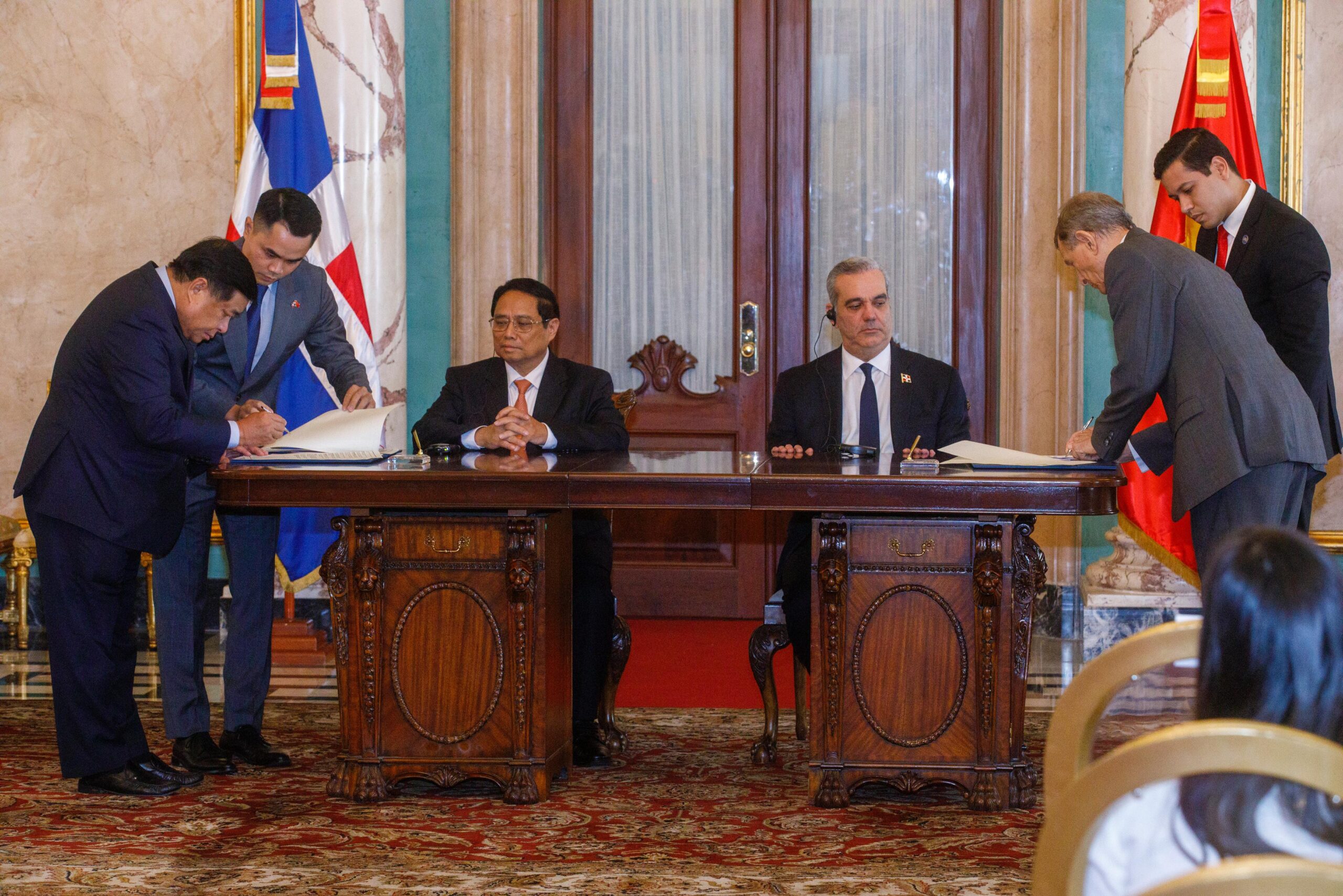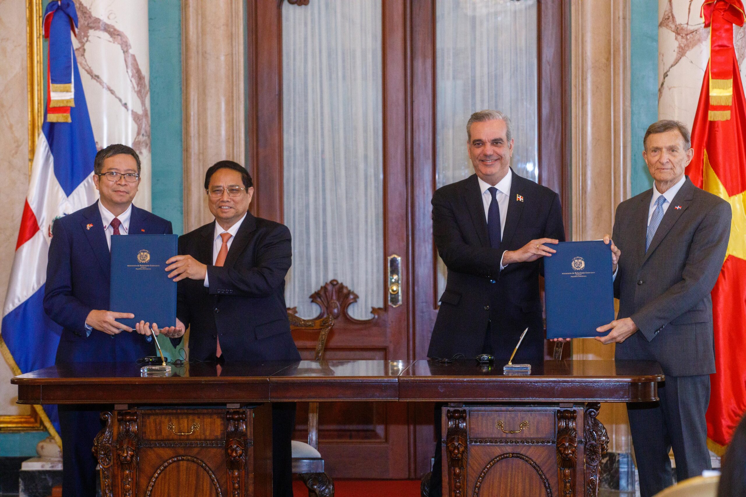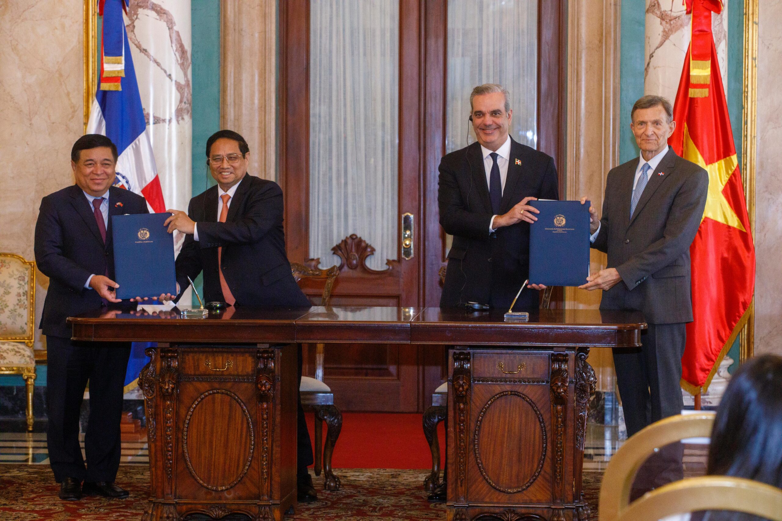 Santo Domingo. – El presidente Luis Abinader y el primer ministro de la República Socialista de Vietnam, Pham Minh Chinh, encabezaron este miércoles la firma de dos históricos Memorandos de Entendimiento para el establecimiento de un Consejo Conjunto en materia de Promoción del Comercio, Cooperación Técnica y fomentar los intercambios académicos y profesionales.