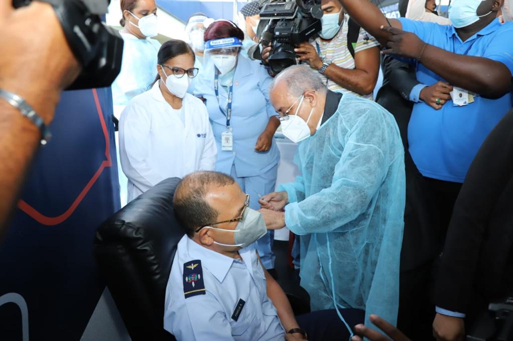 En el acto acompañaron al jefe de Estado  el ministro de Defensa teniente general Carlos Luciano Díaz Morfa; el comandante general de la Fuerza Aérea mayor general piloto Leonel Amilcar Muñoz Noboa; el director del hospital militar, coronel médico José Darío Richardson; los miembros del Gabinete de Salud, así como representantes de la Coordinación Central del Centro Neurálgico del Plan Nacional de Vacunación, unidad responsable de la logística de Vacúnate RD.