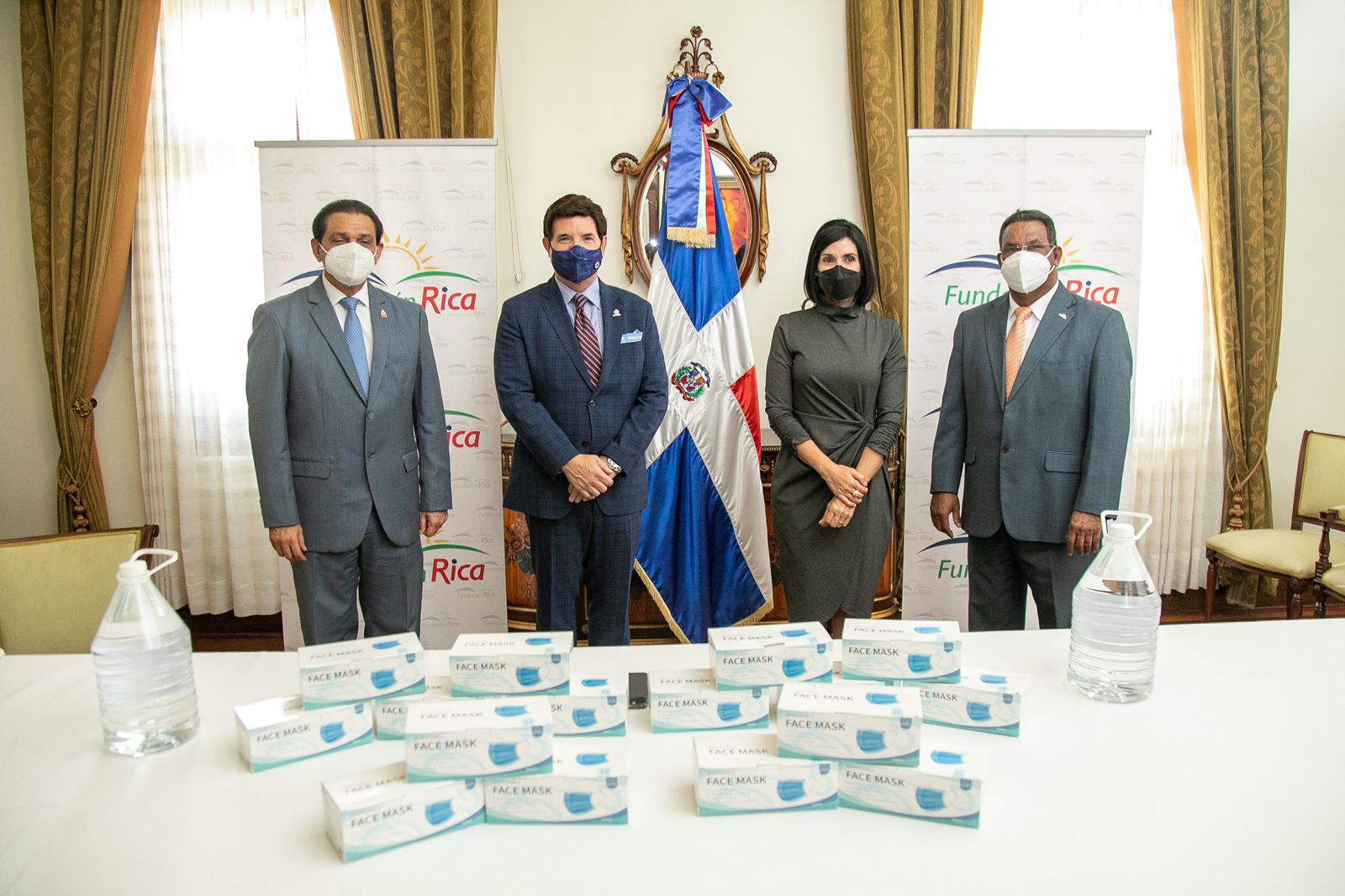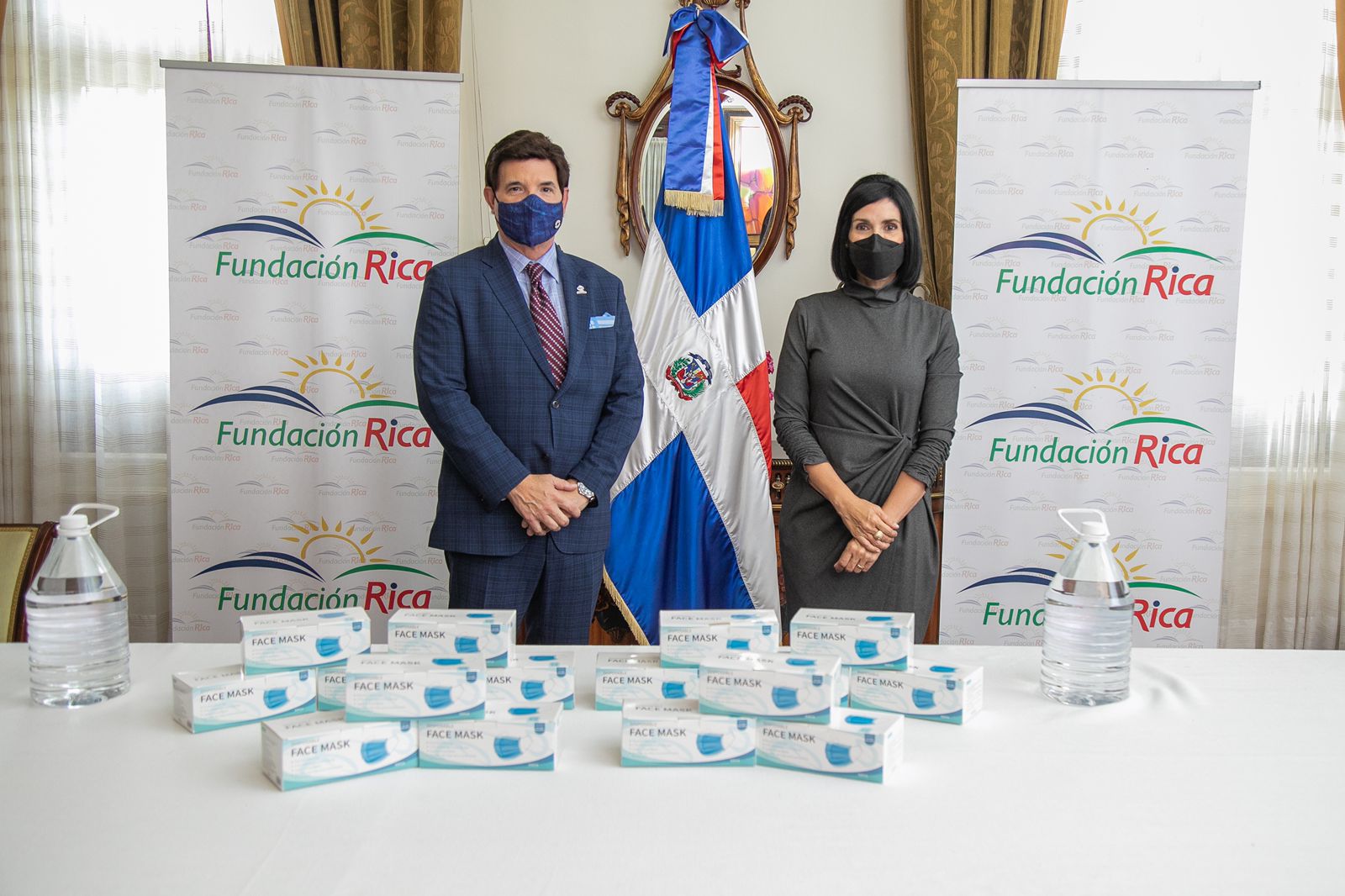 Santo Domingo. La primera dama Raquel Arbaje y el ministro de Salud Daniel Rivera recibieron este martes 250,000 mascarillas quirúrgicas y 120 galones de alcohol donados por la Fundación Rica, para ser distribuidos entre los residentes de los sectores más vulnerables del Distrito Nacional, como parte de los esfuerzos que se realizan para evitar la propagación de la COVID-19 en el país.