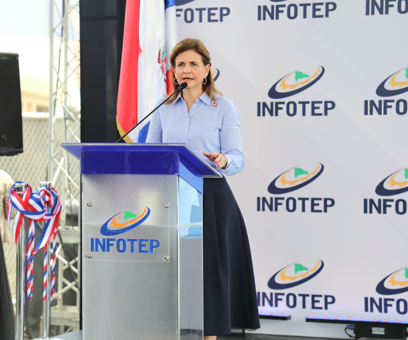 Durante el acto, la vicepresidenta reiteró el compromiso del Gobierno que encabeza Luis Abinader, de respaldar la formación técnico profesional y el impacto del Centro del INFOTEP, en el municipio más grande del país, para el fortalecimiento de las fuerzas productivas de esta zona.