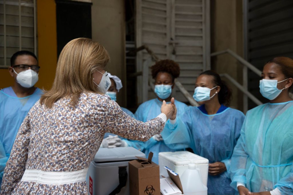 Santo Domingo, sábado 24 de abril de 2021.- La vicepresidenta de la República, Raquel Peña, recorrió varios centros de vacunación del Gran Santo Domingo para supervisar el desarrollo de las nuevas medidas adoptadas por el Gabinete de Salud, en las que se determinó que, a partir de este sábado se amplía el Plan Nacional de Vacunación contra COVID-19, habilitando la inoculación de todos los adultos mayores de sesenta años.